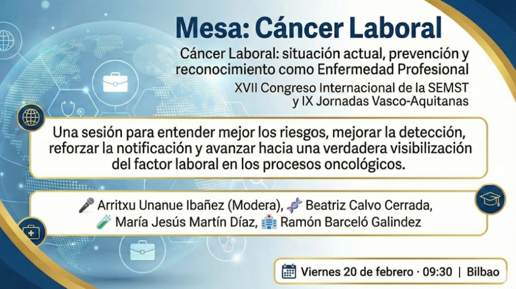El próximo viernes 20 de febrero, la ciudad de Bilbao se convertirá en el epicentro de la medicina del trabajo con la celebración de una mesa estratégica titulada “Cáncer Laboral: situación actual, prevención y reconocimiento como Enfermedad Profesional”. Este encuentro se enmarca dentro del prestigioso XVII Congreso Internacional de la SEMST y las IX Jornadas Vasco-Aquitanas.